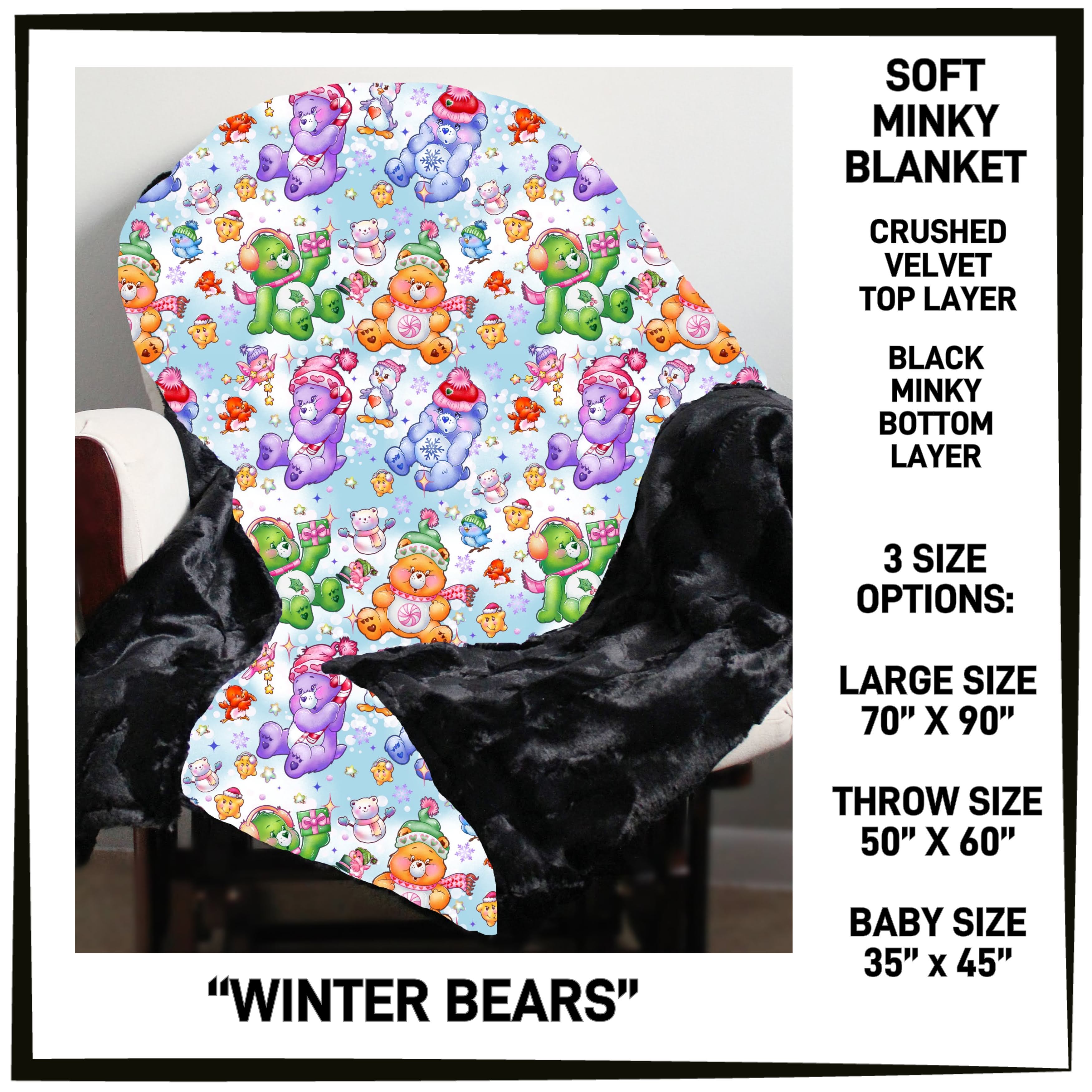 Pick your perfect size: Baby (35" x 45"), Throw (50" x 60"), or Large (70" x 90"). Printed with super soft crushed velvet on one side and plush minky in black on the other.