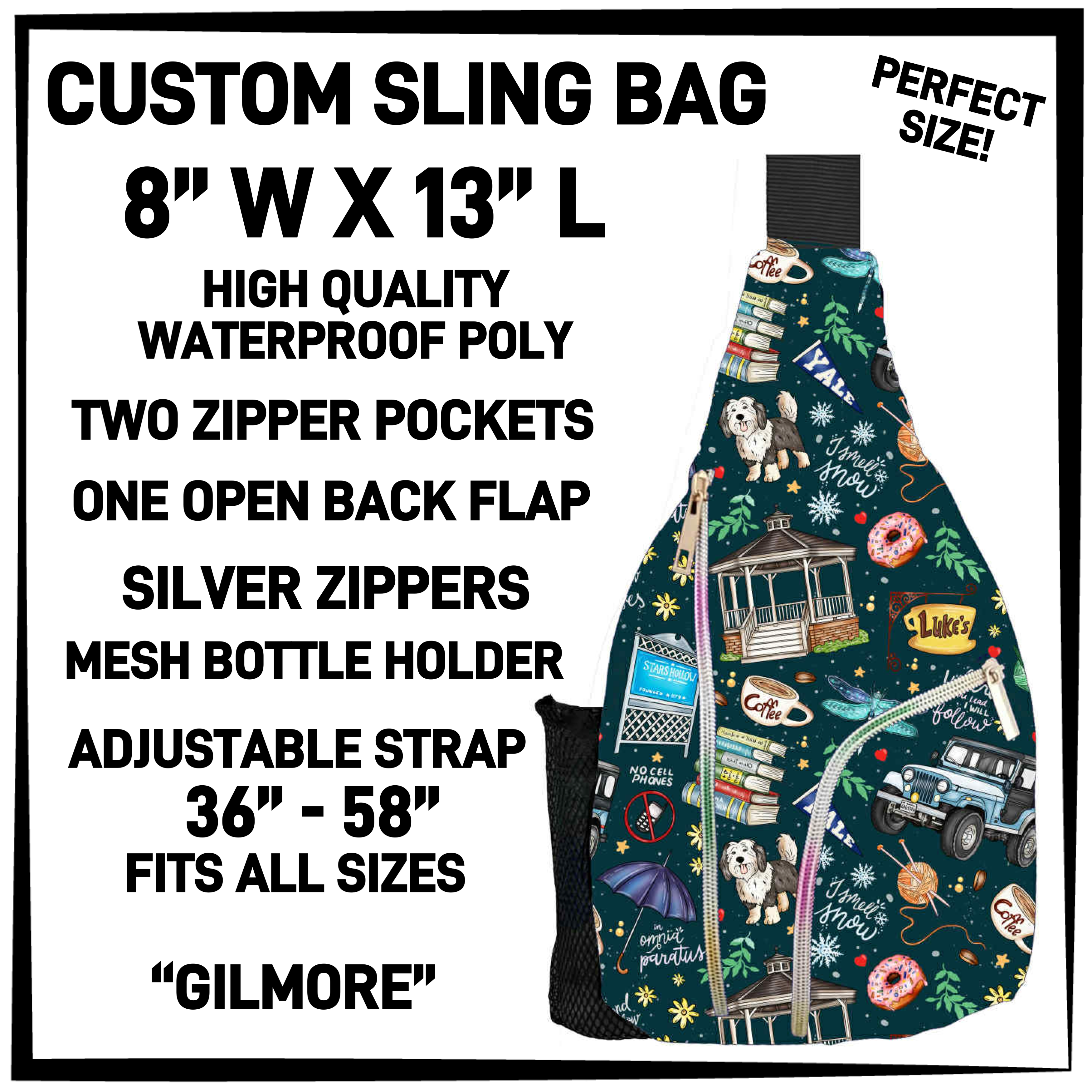 Experience the ultimate in convenience and durability with our custom printed Sling Bag! Made with high-quality waterproof polyester, this bag is your go-to for any adventure. With two zipper pockets, an open back flap, and a mesh bottle holder, you'll have all the space you need for your essentials. And the adjustable strap, ranging from 36" to 58", ensures a perfect fit for any body type. Don't settle for less - get the best with our custom printed Sling Bag!