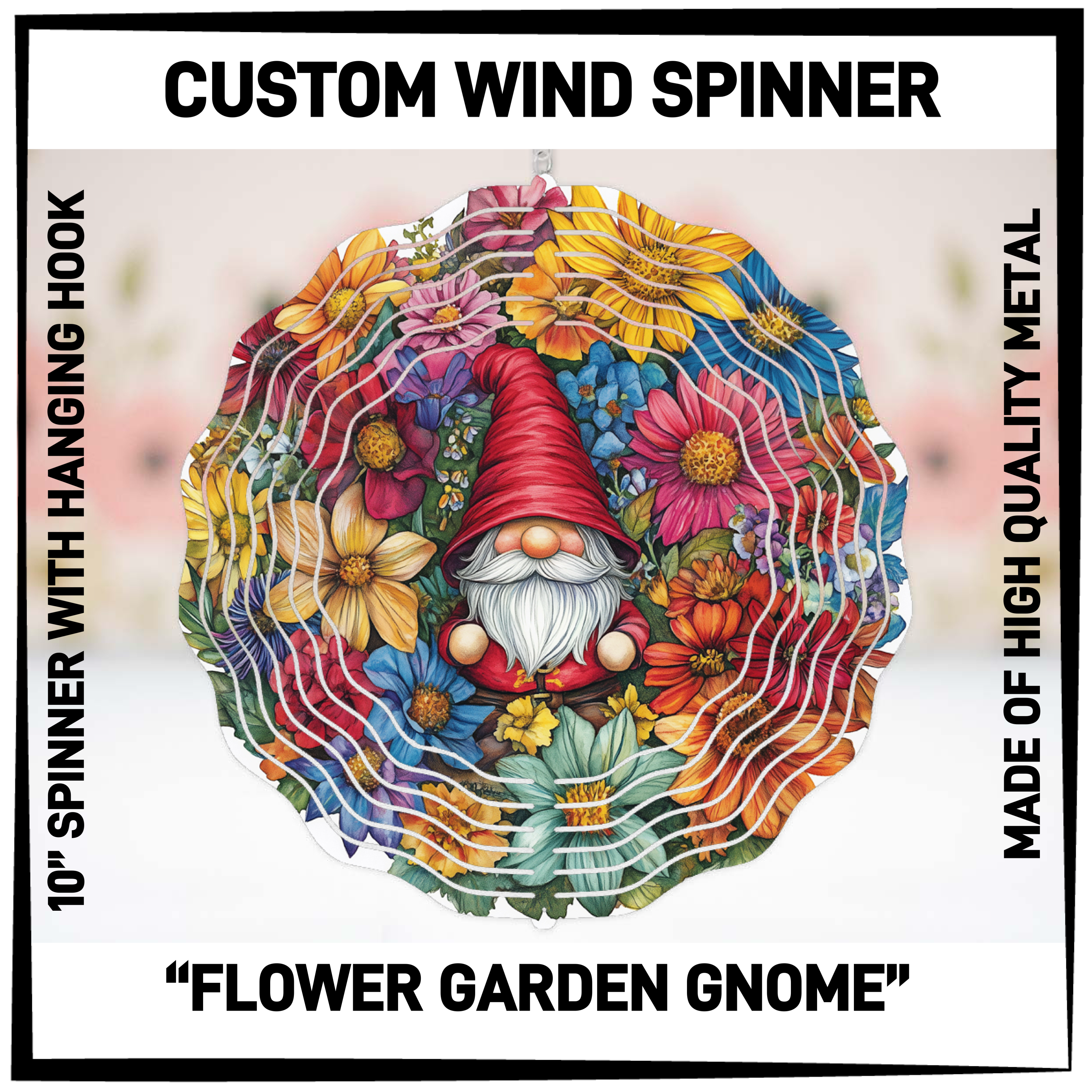 Make your yard the envy of the neighborhood with our custom Wind Spinners. This 10" spinner, made of high quality mental, will catch the eye and add movement to your outdoor space. Plus, the included hanging hook makes it easy to display wherever you choose. Get ready for some serious spinning fun!