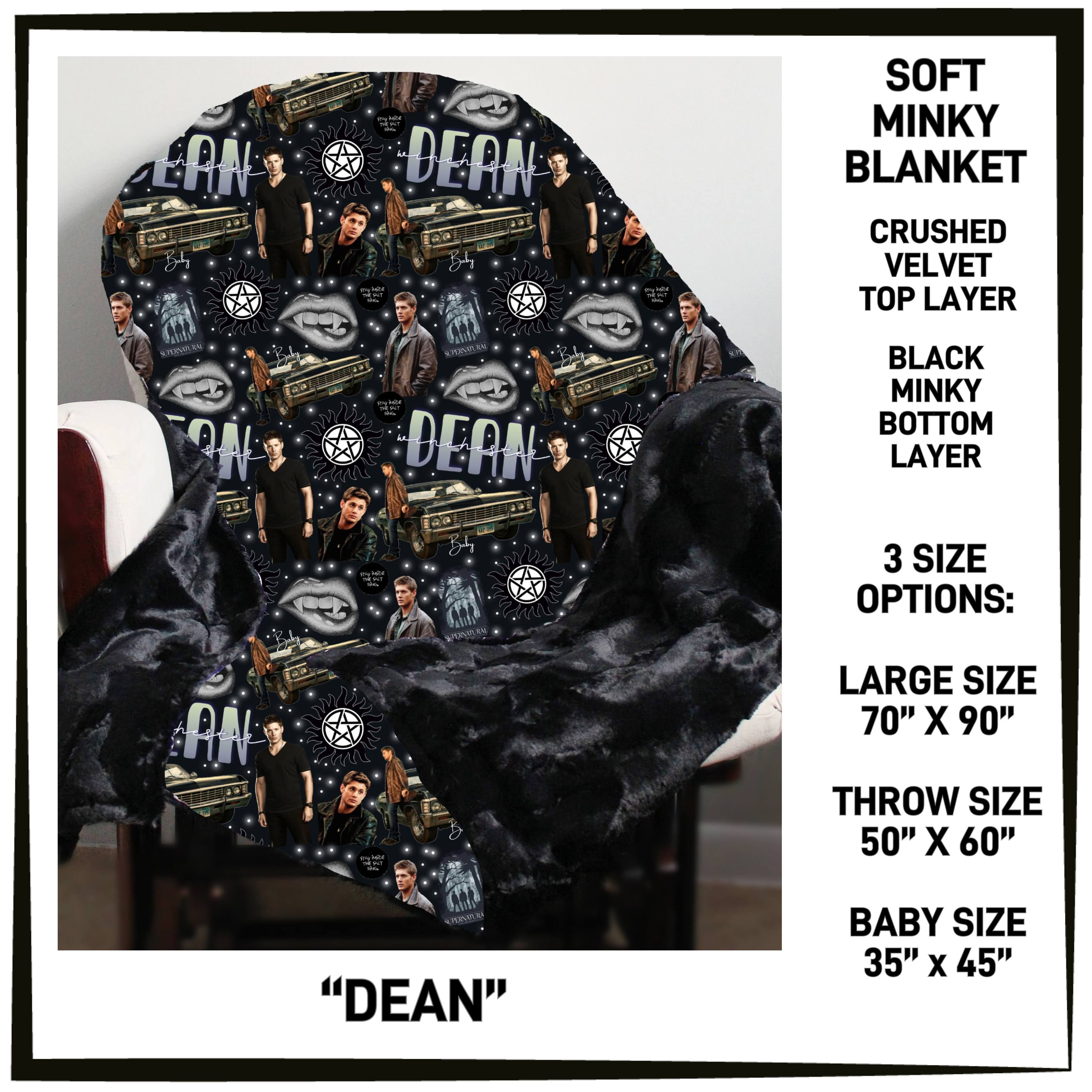 Pick your perfect size: Baby (35" x 45"), Throw (50" x 60"), or Large (70" x 90"). Printed with super soft crushed velvet on one side and plush minky in black on the other.